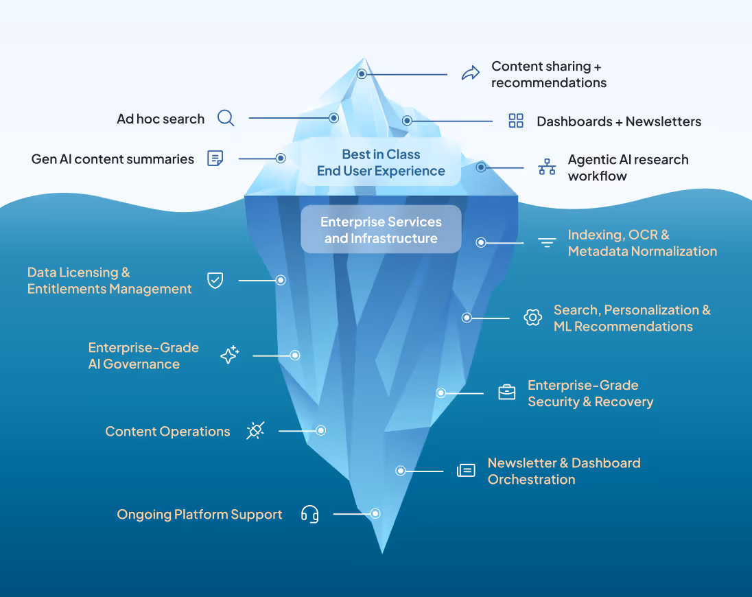 DIY hides real costs in licensing, governance, indexing, and operations—and often delivers a single-use solution. Cut years of effort. Adopt a governed, enterprise-ready platform that delivers value now.